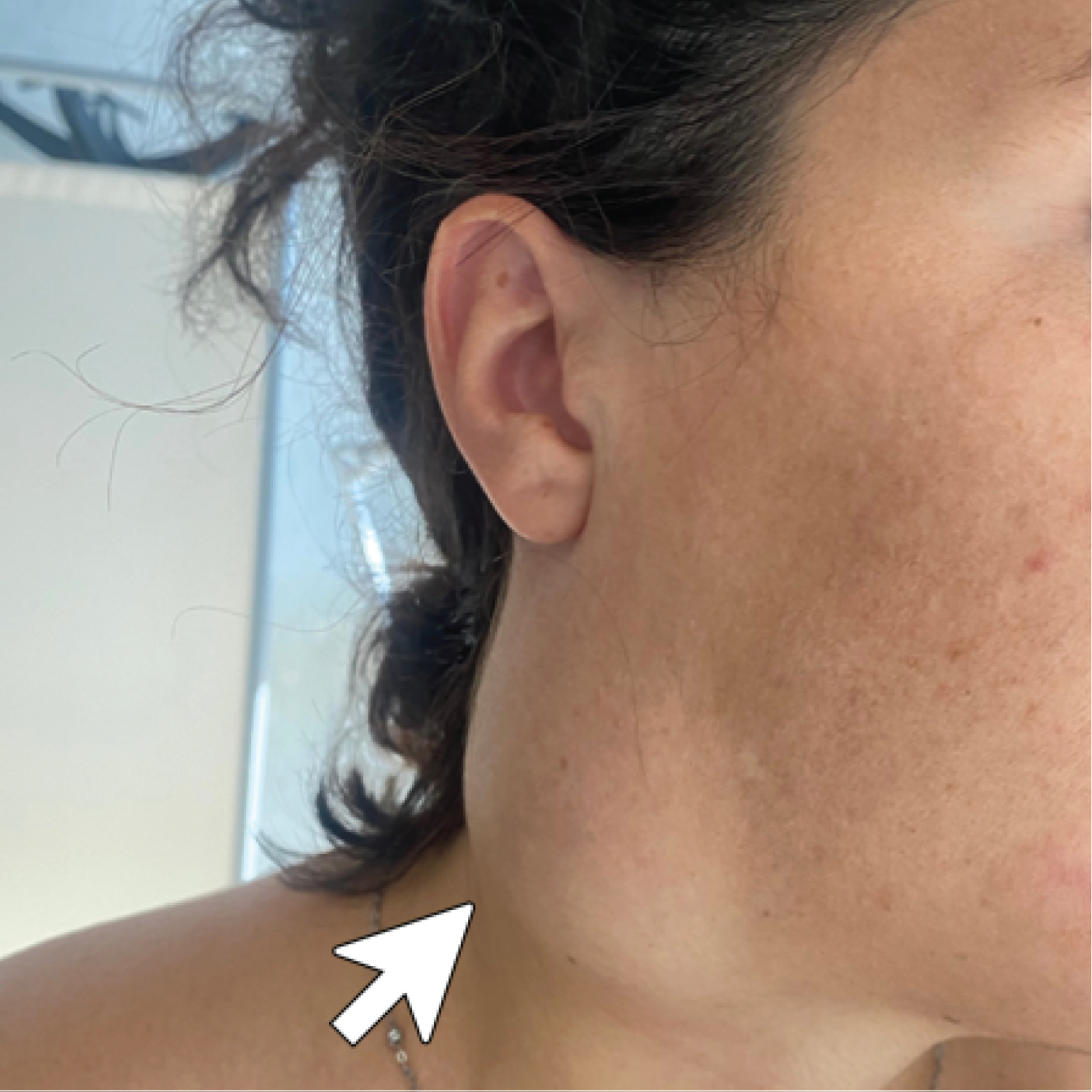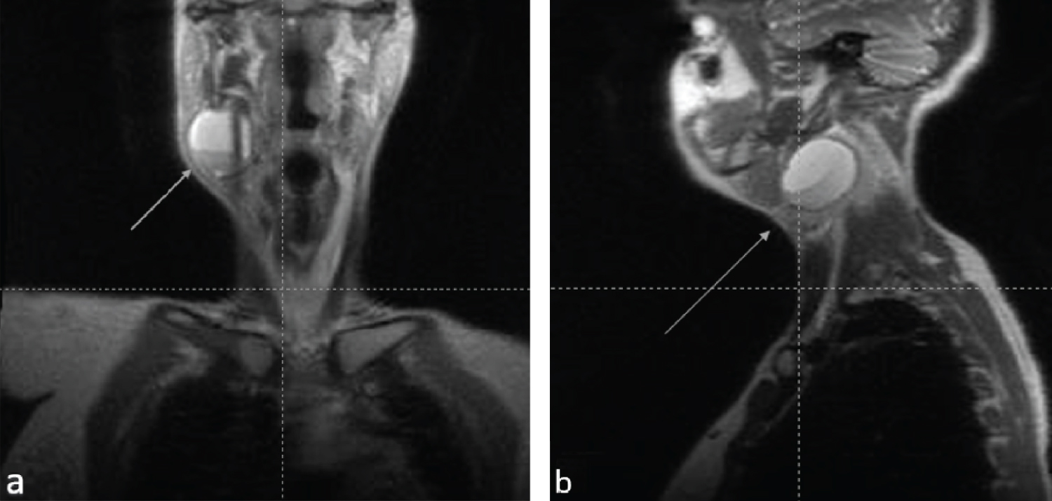 Figure 1: Neck image of a 30-year-old pregnant woman presenting with right sided neck swelling, starting from the seventh month of gestation, compatible with a second branchial cleft cyst.