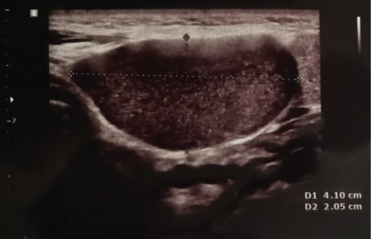 Figure 2: Transverse section of a second branchial cleft cyst ultrasound scan showing an anechoic content with a few hyperechoic spots and no vascular enhancement.