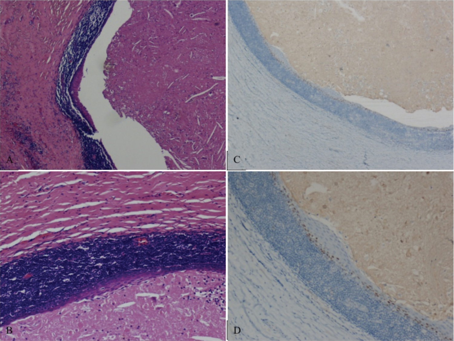 Figure 4: (A,B) Branchial cyst lined by keratinized stratified squamous epithelium with no evidence of adnexal structures (Magnifications A 4X, B 10X), H&E; C,D) Focal based expression of anti-Estrogen Receptors antibody (CONFIRM ER (SP1) Rabbit Monoclonal Primary Antibody) (Magnifications C 4X, D 10X), immunohistochemistry.