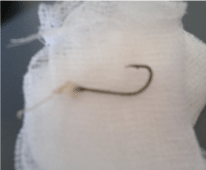 In string-yank method, a string is placed on the curve of fishhook and makes a parallel power tension to the long part of hook. While pulling through a string a downward pressure is applied to the long part of hook so barb displaces into the hooks curved embedded part and moving it back through way of cutting. With using this technique 17.5% fishhooks can be removed [9]. We also used this technique in our case for removal.