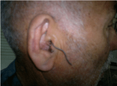 After proper cleaning and dressing, local ansethetic infiltration was made. With microscopic evaluation wire was removed without any complication (Figure 4). There was outer ear canal laceration in proximal outer ear canal and edema in outer part of ear canal. Topical ear drops were prescribed with oral antibiotic pills. After 1 week there was not any signs and symptoms of edema and otitis externa as well as any hearing disorder.