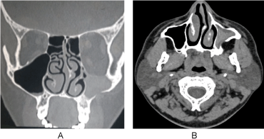 Figure 1: A,B) CT PNS coronal section and axial section showing small maxillary sinus on the left side, with inward retraction of the walls and thinned out bone of the sinus with hypoglobus and opacification of the sinus. View Figure 1