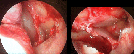 Figure 3: A,B) Prolapsed globe seen through the wide middle meatal antrostomy. View Figure 3