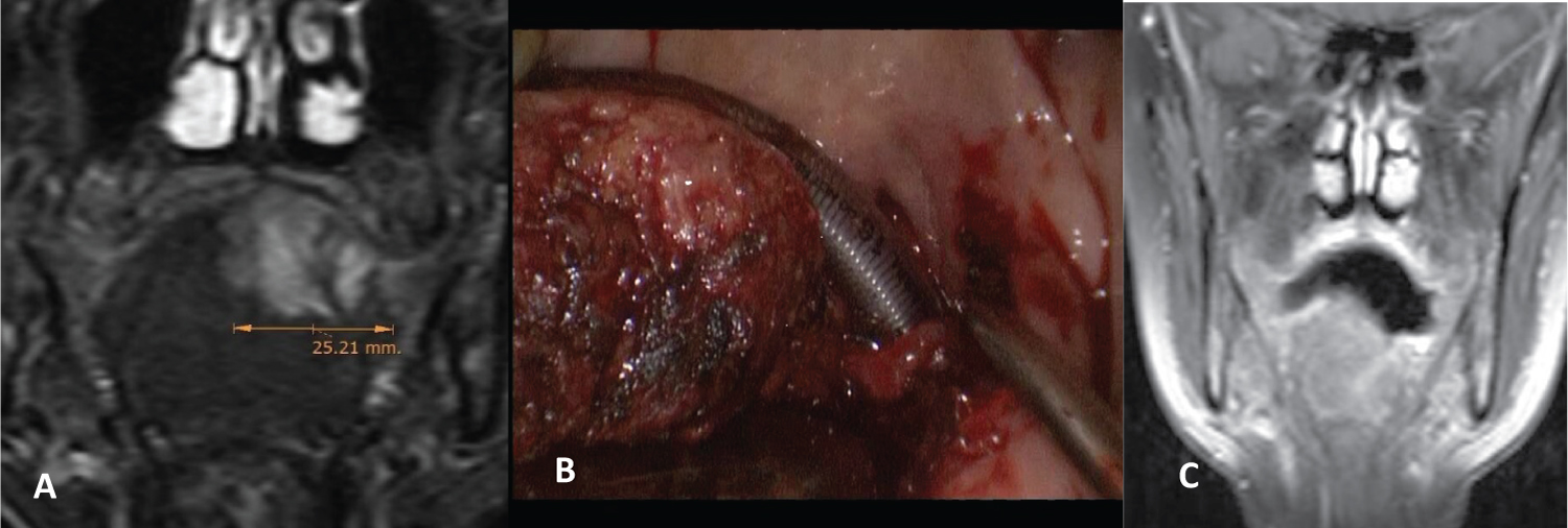 Figure 1: Adenoidecystic carcinoma. A) Preoperative magnetic resonance (MR); B) Tongue base hemiglosectomy; C) Posoperative MR.