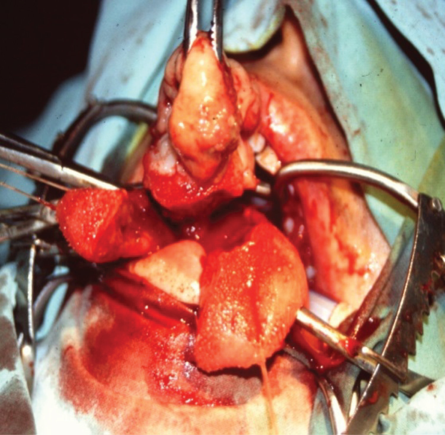 Next, another incision was made perpendicular to the previous one at the level of the midline or a few millimeters on the contralateral side depending on the extension of the neoplasm, up to the vallecula. With a forceps the surgical specimen was tractioned and the deep muscles were sectioned from medial to lateral, at the vallecular level, maintaining a minimum tumor-free margin of 5 millimeters. Upon finding the lingual artery, it was ligated.