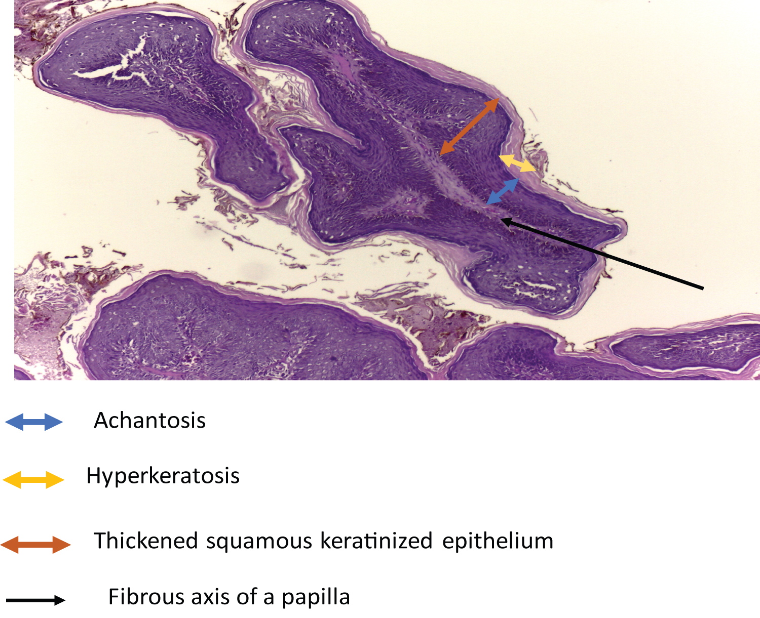 A notion of self-medication based on an antibacterial ointment, and an antibiotic of an unspecified nature by general route was found. This treatment was without improvement. Clinically, the otological examination objected to the right, a flesh-colored outgrowth, with a clear border, grouped in clusters, developed at the expense of the skin of the EAC, painless, filling the entrance to the EAC at its lateral wall. It measured about 4 mm long axis. The contralateral ear was normal and the remainder of the ENT examination was unremarkable. No other localization was found in this patient. Our patient had not benefited from a virological assessment because it was not available. A biopsy of the mass was taken and sent for histological analysis. The anatomopathological study found a keratinized squamous epithelium, papillomatous, thickened, hyperplastic, ortokeratotic, site of high-grade dysplasia with koilocytic cytopathy (Figure 2 and Figure 3). The diagnosis of papilloma of the external auditory canal was accepted.