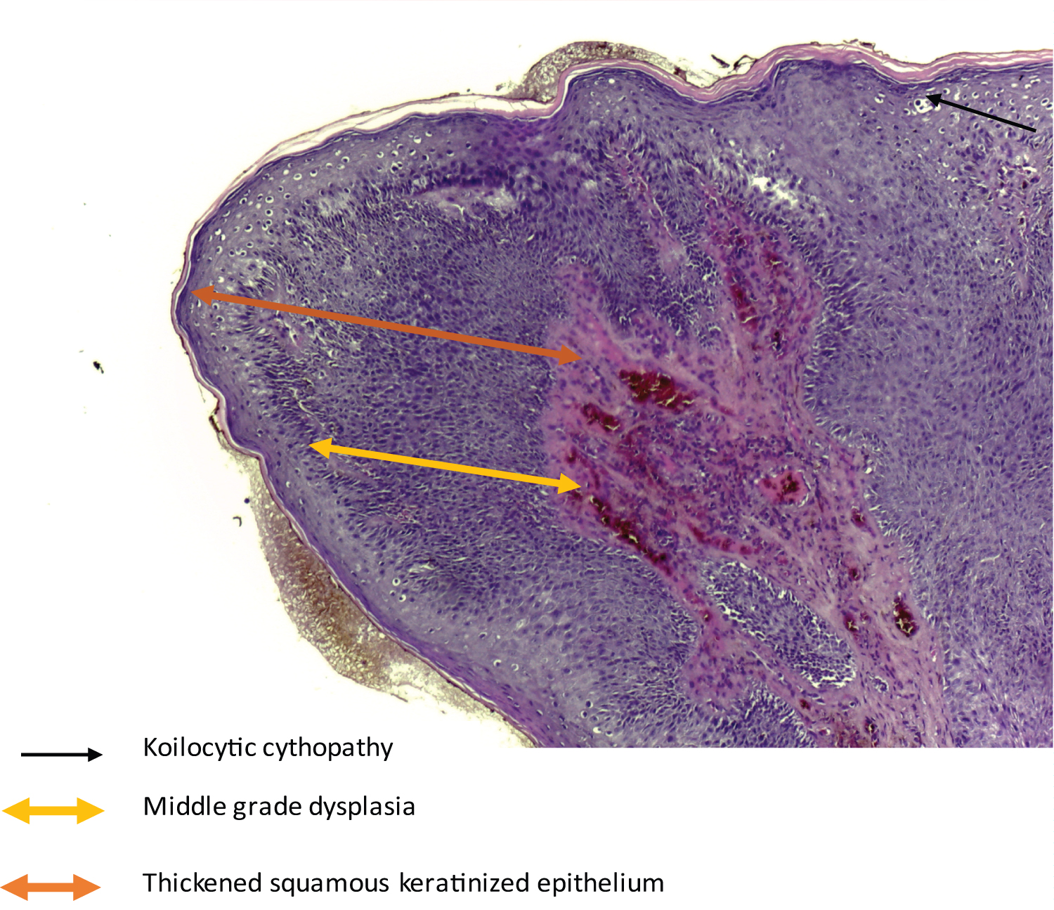 Figure 3: Papilla consisting of a squamous epithelium, seat of high-grade dysplasia with koilocytic cytopathy seen under an optical microscope (HE × 100) in our patient.