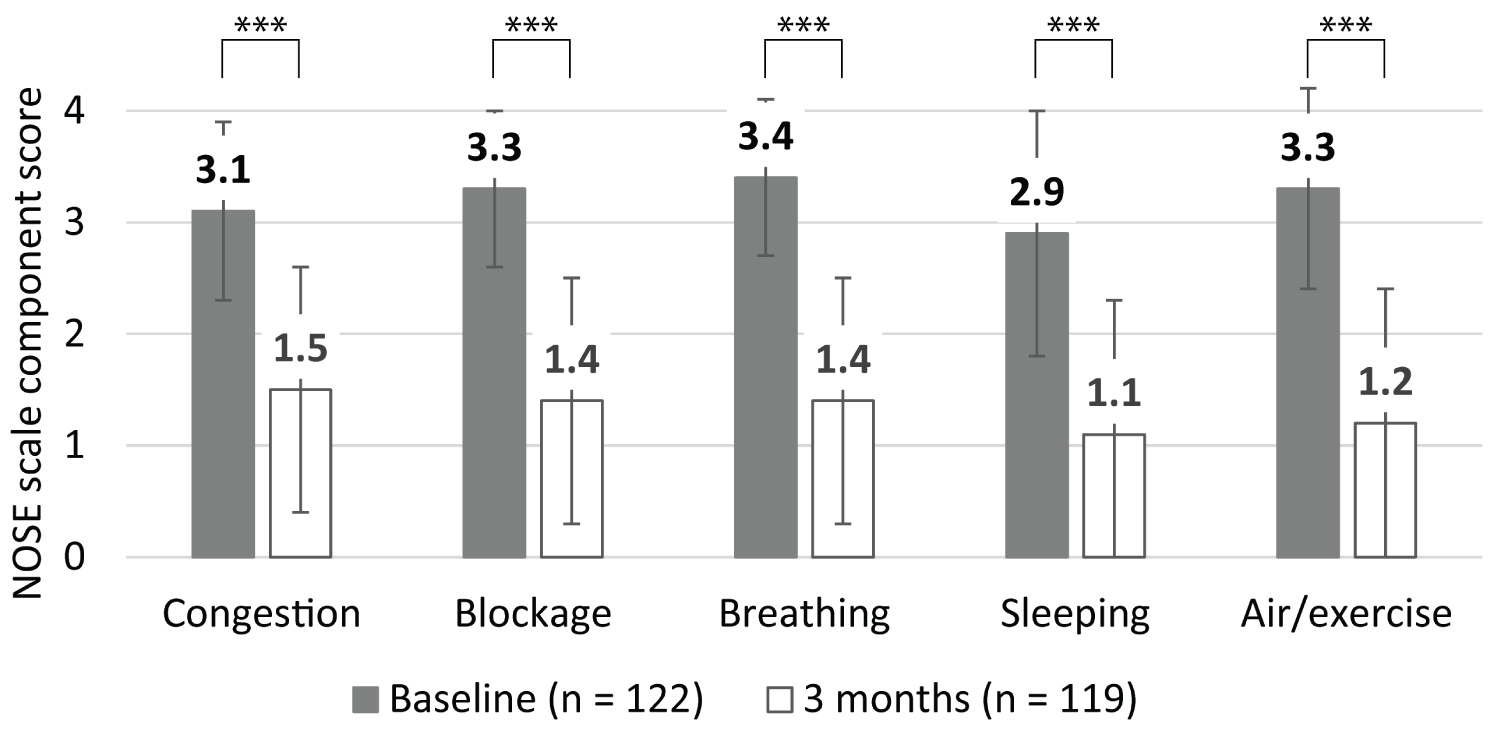 Each NOSE scale component score also improved significantly at the three-month follow-up (P < 0.001 relative to baseline for all component scores; Figure 3). The distribution of scores for each of the NOSE scale components also illustrates the consistent improvement (Figure 4).