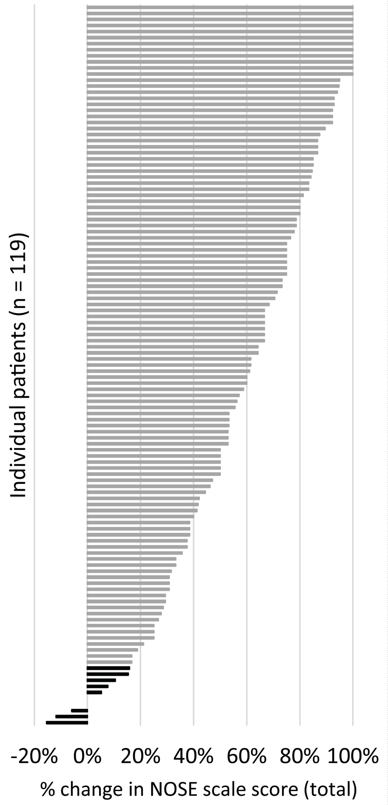 Figure 5: Tornado plot showing the percent change in total NOSE scale score between baseline and three months for each of the patients, where a positive percent change is animprovement (decrease) in NOSE scale score. Non-responders are in black, responders are in grey.
