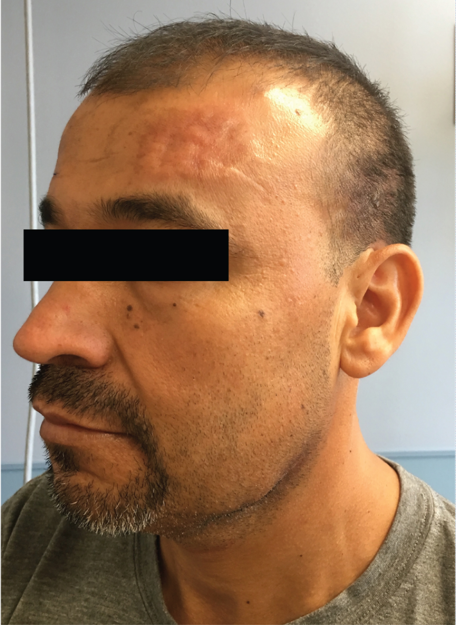 A 39-year-old male was referred to the Otolaryngology clinic from Dermatology for several cutaneous head and neck lesions which had been persistent for the past 10-15 years and slowly increasing in size. Previous biopsies at an outside institution showed infiltrating poorly-differentiated carcinoma with ductal formation of the left forehead (6 × 3 cm) and left lower face (7 × 3 cm), and MAC of the right forehead (2.5 × 1.8 cm) (Figure 1). Three more ill-defined erythematous indurated plaques were noted on the right chin (3 × 4 cm), left temporoparietal scalp (8 × 4 cm), and left axilla (3 × 2 cm). Biopsies were taken at these three sites, which revealed MAC. These lesions were associated with occasional itching but no pain. Additionally, the patient had a right temple lesion that was initially misdiagnosed as basal cell carcinoma. The patient works as a delivery driver, with no history of radiation or family history of cancer. PET CT confirmed no metastatic lymphadenopathy or distant metastases.