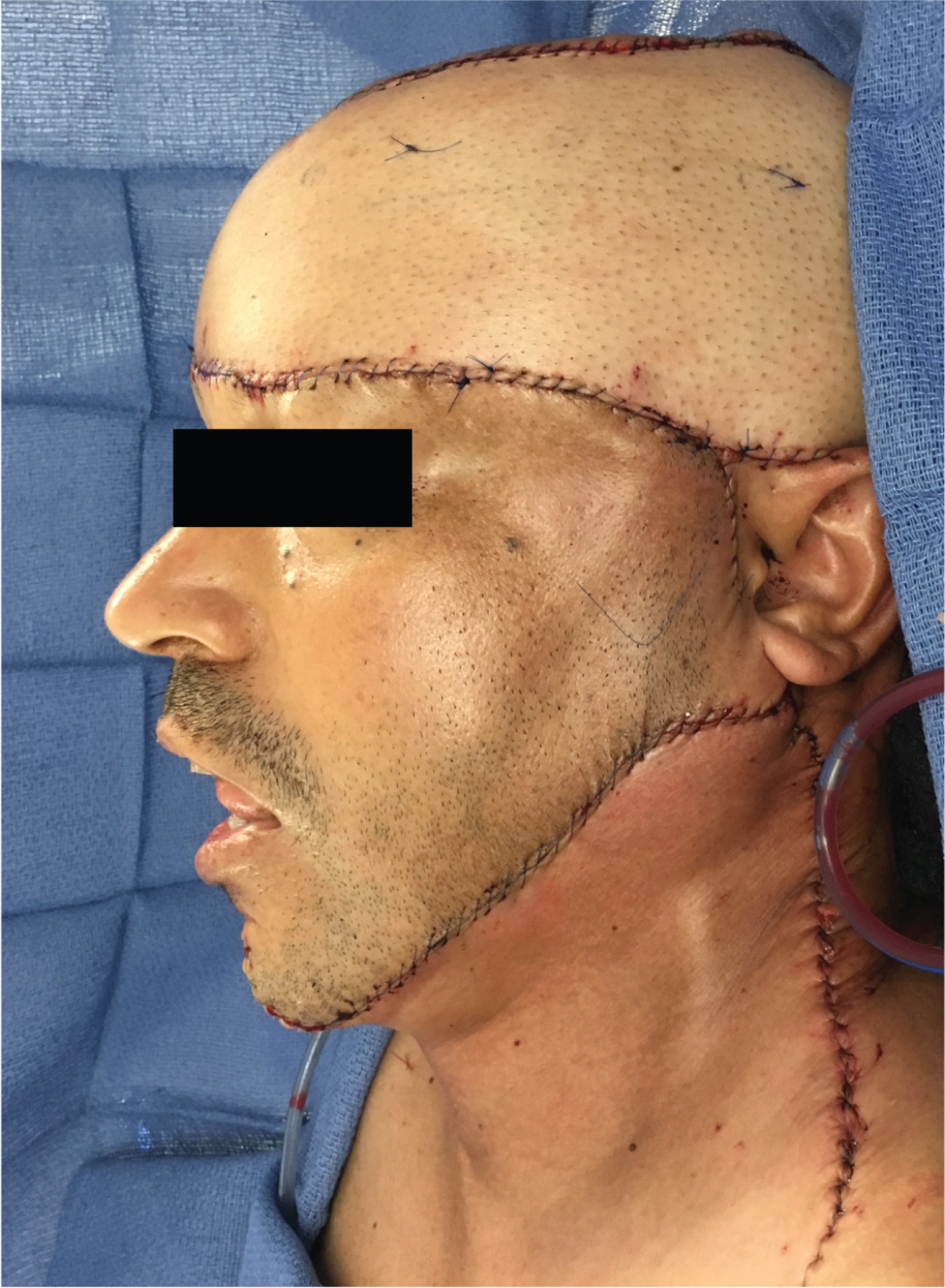 Figure 2: Following wide local excision with reconstruction via anterolateral thigh (ALT) fasciocutaneous free flap and cervicofacial advancement flap.