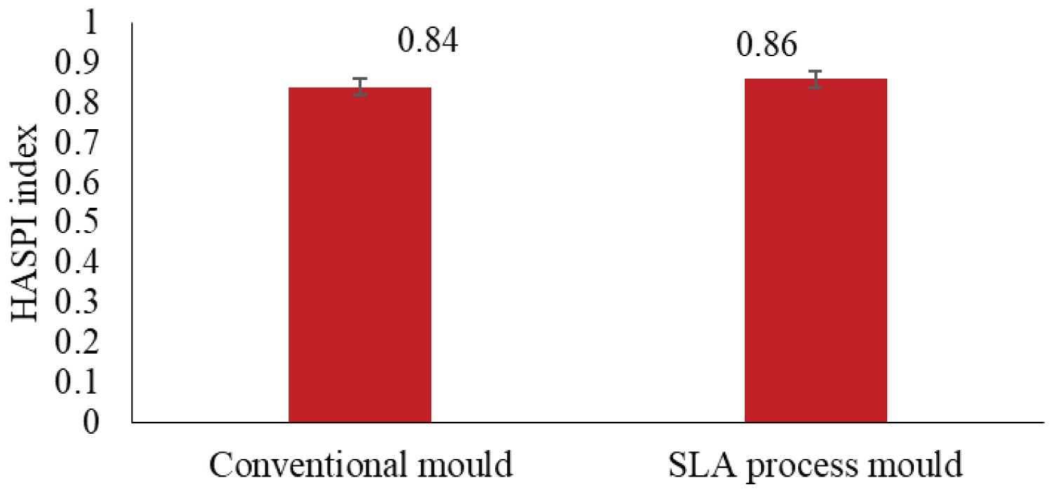 The mean HASPI for SLA and conventional moulds with 3 mm vent was 0.86 (SD = 0.03) and 0.84 (SD = 0.02), respectively. The mean HASQI for SLA process mould with 3 mm vent was 0.34 (SD = 0.03), and for conventional mould was 0.29 (SD = 0.03). Figure 3 and Figure 4 represent the HASPI and HASQI of conventional and SLA-processed ear moulds with vents.