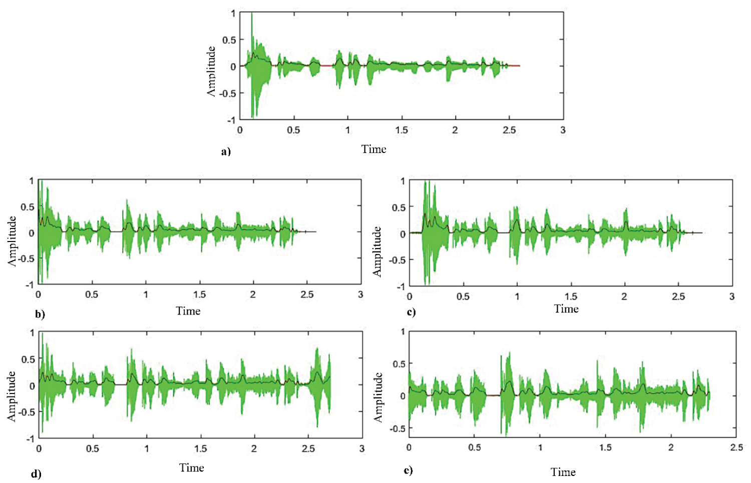 Figure 5: Waveform plots of the stimuli and output responses (a) Unprocessed stimuli; (b) Processed in the SLA mould without vent; (c) Processed in conventional mould without vent; (d) Processed in SLA mould 3 mm vent; (e) Processed in conventional mould with 3 mm vent.