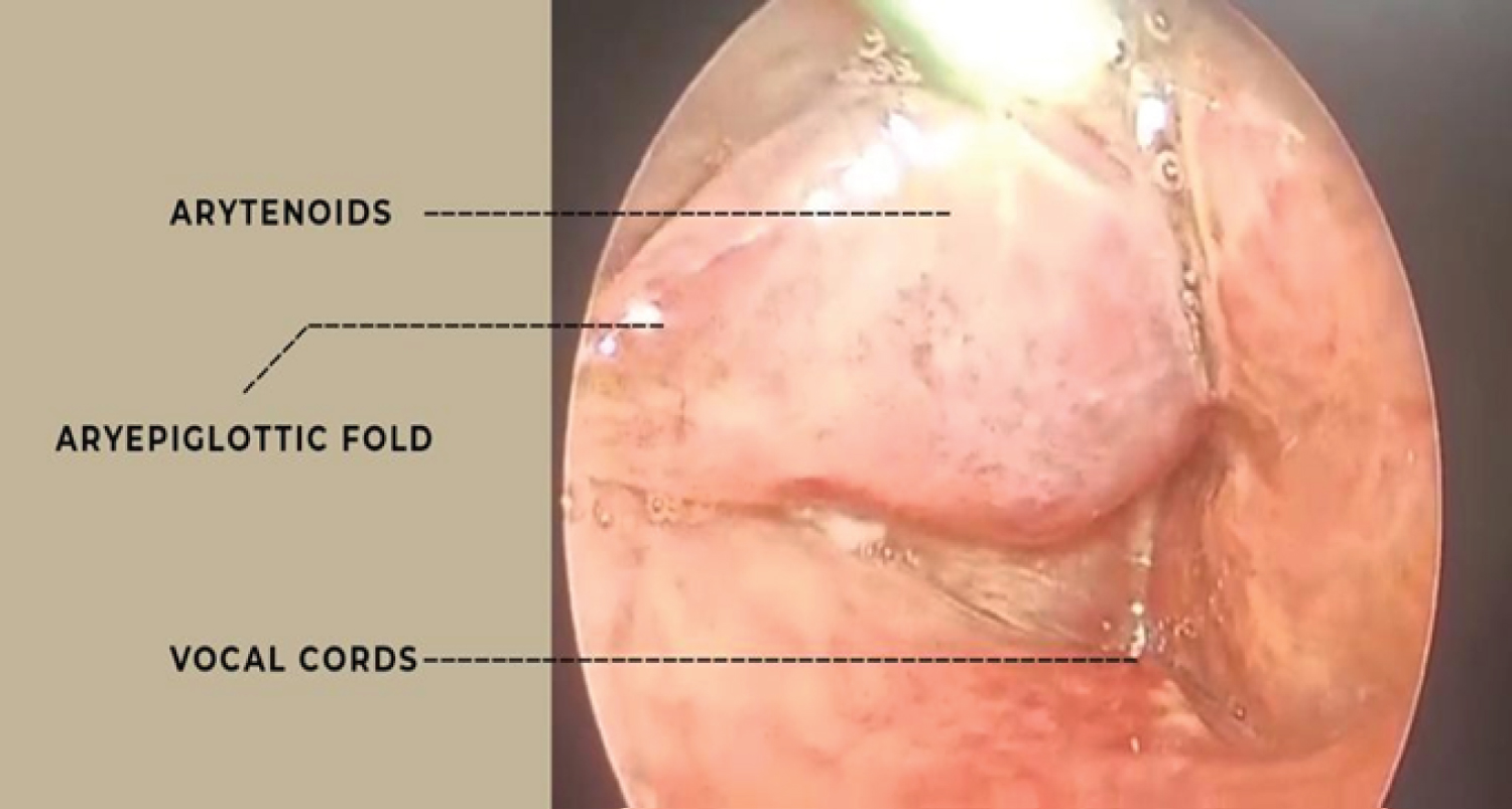 Figure 2: Video laryngoscopy (Post-Treatment): Showed normal epiglottis, arytenoids, and ventricles and oedema from the previous video laryngoscopy completely resolved, the right vocal cords mobile and left vocal cord fixation persisted.