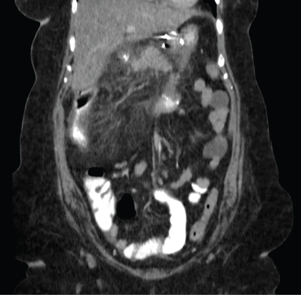 Figure 1: CT scan of patient #1, showing colitis of the hepatic flexure and proximal transverse colon. View Figure 1