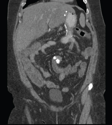 Patient #1 is a 52-year-old woman who had undergone a Silastic Ring Vertical Gastroplasty (SRVG) for morbid obesity in 1980, with an initial Body Mass Index (BMI) of 64.6 Kg/m². She lost 33 Kg during the first year after the operation, but since then her weight was stable with no further reduction. In 1998 she underwent an open cholecystectomy. With a BMI of 52.6 Kg/m², she was referred to our department for a revisional bariatric operation. Laboratory test results taken preoperatively, at readmission, and at discharge, are shown in Table 1. She underwent an uneventful laparoscopic BPD. Some intraoperative measures are shown in Table 1. The early post-operative period was unremarkable. Some post-operative parameters are also shown in Table 1. Seven weeks after the operation she started to complain of vague right abdominal pain and watery diarrhea and was ultimately diagnosed with colitis of the hepatic flexure and proximal transverse colon, based on computerized tomography (CT) (Figure 1). Her laboratory tests were as shown in Table 1. Stool cultures were negative for Salmonella, Shigella, Campylobacter Jejuni, and common parasites routinely examined in our hospital. The stool was also negative for Clostridium Difficile toxins A and B. She was treated with intravenous empiric antibiotics, resulting in a quick clinical and laboratory improvement (Table 1). Six weeks after her discharge, a colonoscopy was performed, demonstrating a normal mucosa throughout the colon, with no signs of inflammation or any other pathology. Random biopsies taken from hepatic flexure mucosa were normal. Since that event, she reported no other attacks of abdominal pain, diarrhea, or any other complaints.