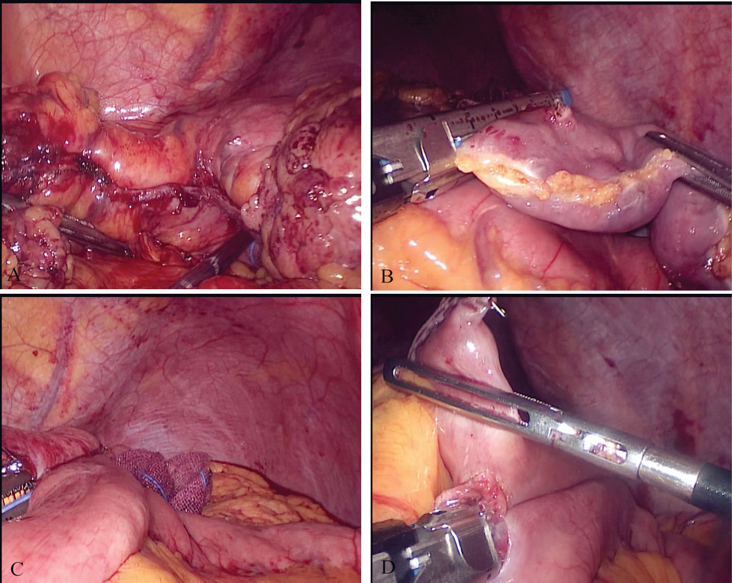 The patient underwent laparoscopic gastric bypass surgery on the fifth day after admission. Postoperative changes as a result of the modified gastric bypass could be seen in the abdominal cavity (Figure 1A). There was no bleeding exudate, and the remaining organs were normal. From the original 35 cm gastrointestinal anastomosis, the proximal jejunum was closed using a linear cutting staple by an end-to-side anastomosis (Figure 2B), and the gastric fundus and proximal jejunum were removed (Figure 1C). A small stomach pouch of about 30 mL was established using standard gastric bypass surgery (Figure 2A), with a 100 cm alimentary limb and a 100 cm bilio-pancreatic limb (Figure 1B, Figure 2C and Figure 2D). There were no complications during the hospital stay. The patient recovered very well and was discharged on the sixth day after surgery.