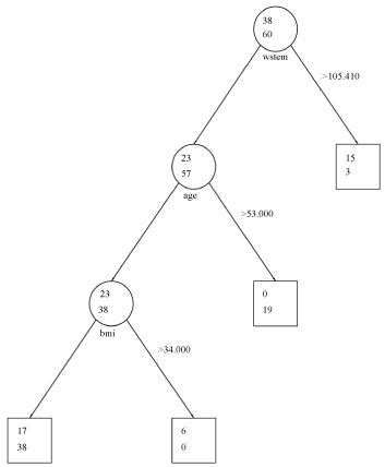 Classification and Regression trees (CARTs) [18] were analyzed to confirm logistic regression findings without imposed cut-offs. Of particular interest were patterns of association by gender. Recursive partitioning was employed to force the data into homogeneous groups according to an entropy criterion [18]. The covariates (BMI, WC, age, systolic blood pressure, self-reported hypertension, and self-reported diabetes) and the response variable (eGFR) were defined as in logistic regression with the response representing whether an individual had an eGFR < 130 or greater than or equal to 130. The resulting regression tree consists of nodes represented by circles and boxes. The first node is the root, consisting of the entire sample and the subsequent nodes consist of subsets of the sample. The tree divides each internal node into two offspring nodes, which are determined by the values of one of the covariates and is intended to offer the "best possible" split, sending individuals to one offspring node or the other based on the imposed eGFR cut-off. This process continues recursively, and the process stops itself when the finite number of individuals in the sample is exhausted.