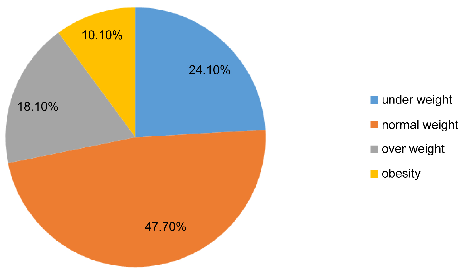 Data on BMI showed that 24.1% of the total population sample was underweight, 47.7% normal weight, 18.1% overweight and 10.1% obese. Thus, the overall prevalence of overweight and obesity among these students was 28.2% (Figure 1).