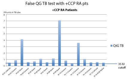1. The test measures interferon after prolonged incubation; interferon is spontaneously produced by RA patients. The "false positive" tests from QFT-G are generally borderline low positive (Figure 1).