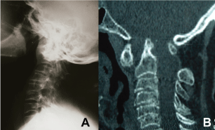 Figure 1: Lateral view radiography (A) of a patient with RA of CVJ, showing the difficulty to visualize CVJ. The diagnosis of pathologies in this region in simple radiographs might be difficult. CT with sagittal reconstruction (B) of the same patient, clearly showing the presence of atlantoaxial instability associated to basilar invagination. View Figure 1