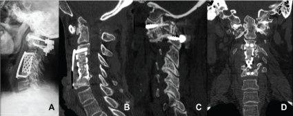 Figure 3: Profile radiography (A) CT sagittal reconstructions (B and C) and coronal (D) postoperative of the same patient, illustrating the surgical treatment performed with posterior atlantoaxial distractive arthrodesis through Goel technique for the treatment of basilar invagination, and anterior decompressive corpectomy with arthrodesis for the treatment of subaxial instability. View Figure 3