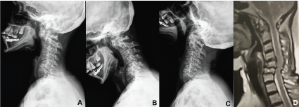Figure 2: Profile radiography (A), CT with sagittal reconstructions (B and C) and NMR sagittal acquisition (D) preoperative of a patient with RA Ranawat IIIa, illustrating the association of basilar invagination and instability with subaxial myelopathy. View Figure 2