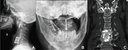 Figure 5: Profile radiography. (A) transoral radiography; (B) and TC with coronal reconstruction; (C) postoperative of the same patient, illustrating the surgical treatment performed with anterior trans articular atlantoaxial arthrodesis for the treatment of atlantoaxial instability associated to decompressive corpectomy with anterior arthrodesis for the treatment of subaxial instability. View Figure 5