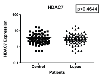 Figure 3: Note: HDAC 7 mRNA expression among women with SLE vs. matched Controls. GAPDH was used as the housekeeping gene for comparison. The p-value was (p < 0.4644) which indicated was no significant differences between the two populations.