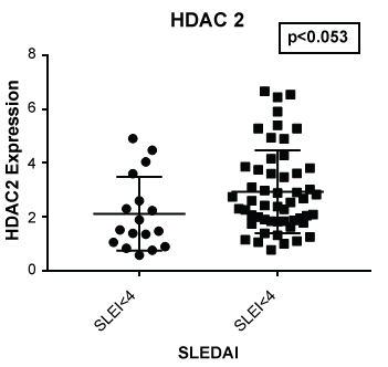 Figure 5: Expression of HDAC 2 in lupus patients with a SLE disease activity index (SLEDAI) of less than 4 (SLEI < 4) and 4 or greater (SLEI > 4). Those with more severe disease had a higher expression of HDAC2 (p < 0.053) compared to those with modest disease or with a SLEDAI of less than 4.