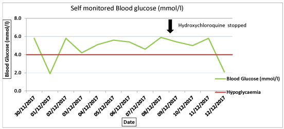 Although this is an unusual finding in our case, the Hydroxychloroquine packaging insert provides a warning that hypoglycaemia could occur [9]. There has been a recent placebo-controlled study involving pre-diabetic patients randomised to receive hydroxychloroquine or placebo. This found a reduction in blood glucose levels in the hydroxychloroquine group after 12 weeks [10]. From the patient's record of blood glucose levels there was a recorded hypoglycaemic episode recorded three days after treatment cessation. This can be explained by the prolonged terminal half-life of hydroxychloroquine which can be between 40 and 50 days [11]. The patient recorded chart shows there were no further hypoglycaemic episodes in the 12 days after this and he remained well.