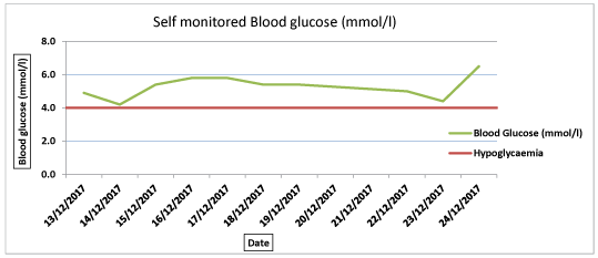 Figure 2: Patient's self-reported blood glucose monitored between 13/12/2017 - 24/12/2017.