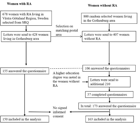 A total of 155 women with RA and 173 women without RA answered the FFQ, resulting in a response rate of 36% (155/428) and 28% (173/617) respectively. The FFQ was answered by 15 women who had not signed the consent form and who were therefore excluded. Hence, in the final analysis 150 women with and 163 women without RA were included.