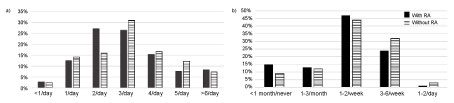 No significant differences were seen in fruit and vegetable intake between women with RA and in women without RA (Table 2). A compiled variable for the intake frequencies of root vegetables, legumes, vegetables, fruit and berries showed that 16% of women with RA and 19% of women without RA consumed fruit and vegetables five times a day or more (Figure 2a).