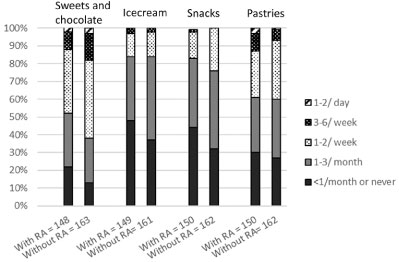 The aim of the present study was to examine possible differences in dietary intake between Swedish women with and without RA and to identify potential variations in the women's intakes of fruit and vegetables, red meat, seafood, fat quality and foods with limited nutritional values such as sweets, ice cream, snacks and pastries.