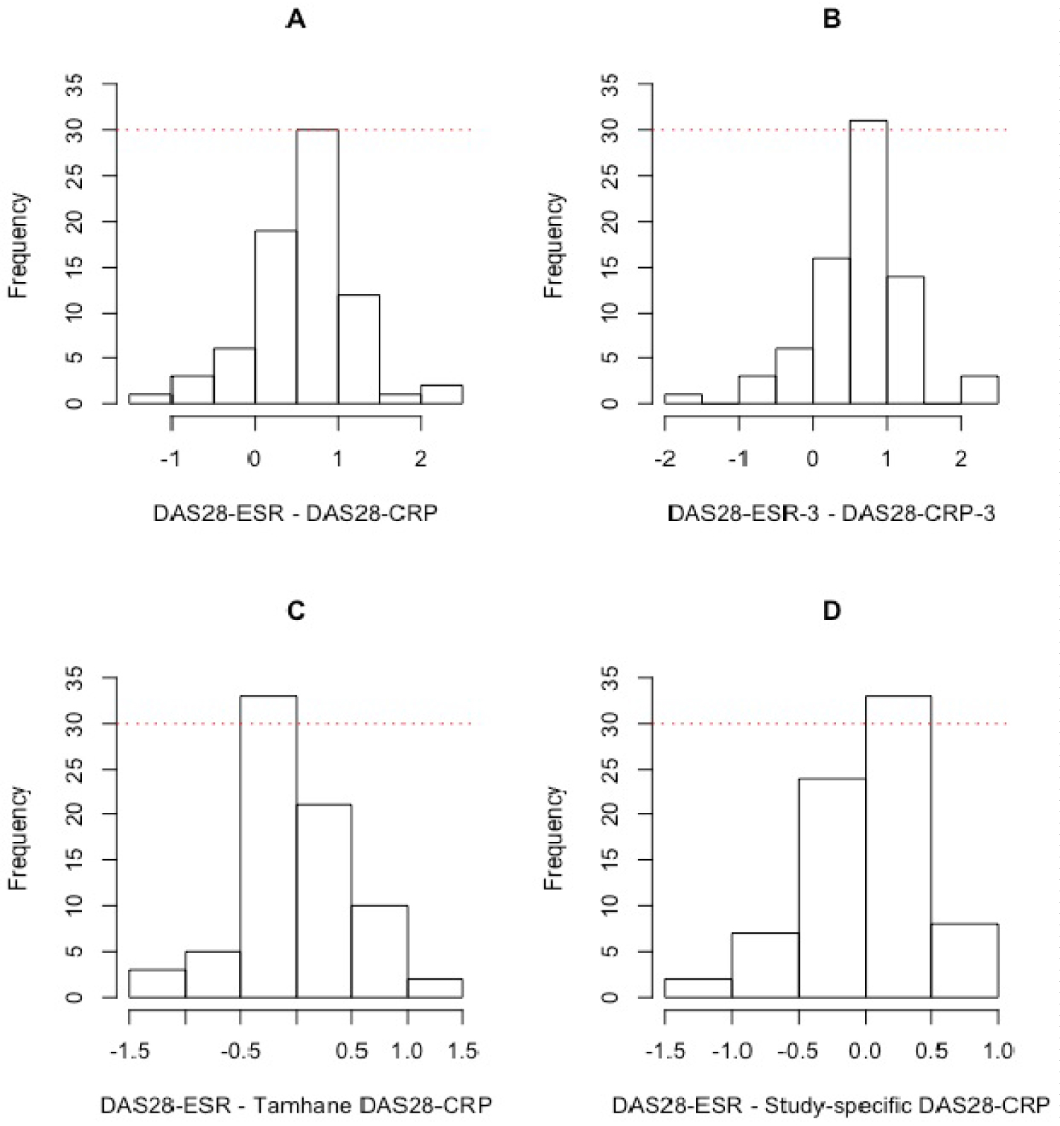 Data for DAS28 scores comparisons using the paired t-tests given in Table 2 showed a significantly higher DAS28-ESR mean score compared to the mean DAS28-CRP both for standard scores (DAS28-ESR and DAS28-CRP, Δ = 0.58, [95% confidence interval: 0.45-0.71]; p < 0.0001) and those using three variables (DAS28-ESR-3 and DAS28-CRP-3, Δ = 0.51 [0.46-0.75]; p < 0.0001). Nevertheless, the standard mean DAS28-ESR was comparable to the mean adjusted DAS28-CRP scores derived from Tamhane and the current study data-specific score (Δ = -0.018 [-0.14-0.10]; p = 0.7563, Δ = 0 [-0.10-0.10]; p = 0.9992) respectively. In addition, the comparison between the mean of DAS28-CRP scores from this current study data-specific and Tamhane showed no significant differences (Δ = -0.018 [-0.08-0.04]; p = 0.5341).
