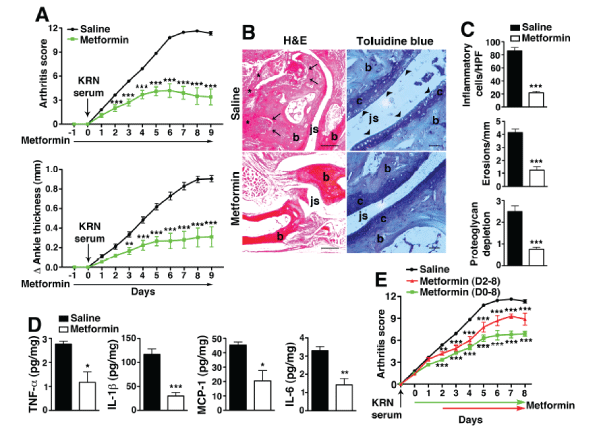 Experimental arthritis was induced with the passive transfer of serum from the KRN/I-Ag7 (K/BxN) mice [13]. The disease caused by arthrogenic autoantibodies in KRN serum shares many features with human RA [14]. WT C57BL/6 mice were injected i.p. with 175µl of KRN serum on day 0. Clinical arthritis was evident after 24 h and maximal disease developed around day 6-7. Metformin [150mg/kg] was injected i.p. every day, starting on day -1 and continued for the duration of the experiment. Metformin treatment significantly suppressed clinical disease compared with saline control (Figure 1A). In parallel with improved clinical scores, we observed on histological analysis a marked decrease in inflammatory cell influx, bone erosions, and cartilage degradation (Figure 1B,1C). Moreover, joint-associated inflammatory cytokines (TNF-α, IL-1β, IL-6, MCP-1) levels on day 9 were all significantly suppressed in the metformin treatment group (Figure 1D). Even when metformin treatment was delayed until day 2 post-KRN serum administration, when arthritis is established, we still observed significant suppression of disease activity (Figure 1E). Taken together these results suggest that metformin is effective at suppressing arthritis especially when started early or during the preclinical phase of the disease when there are elevations of disease-related biomarkers (i.e. anti-citrullinated peptide antibodies and/or rheumatoid factor) but no overt joint symptoms [15,16].
