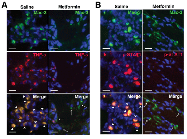 was significant colocalization (yellow) of TNF-a and phospho-STAT1 with Mac-3+ cells (arrowheads) while metformin treatment suppressed both TNF-a and