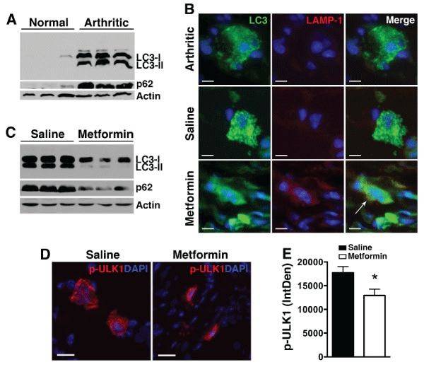 for protein loading. (B) Paw sections from untreated arthritic mice or arthritic mice treated with saline or metformin were stained for LC3 (green) and the