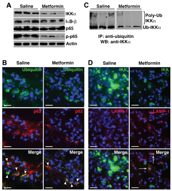 the saline controls while IKKa level was significantly lower in metformin-treated animals. Colocalization of IKKa and LAMP-1 (arrows) in metformin treatment
