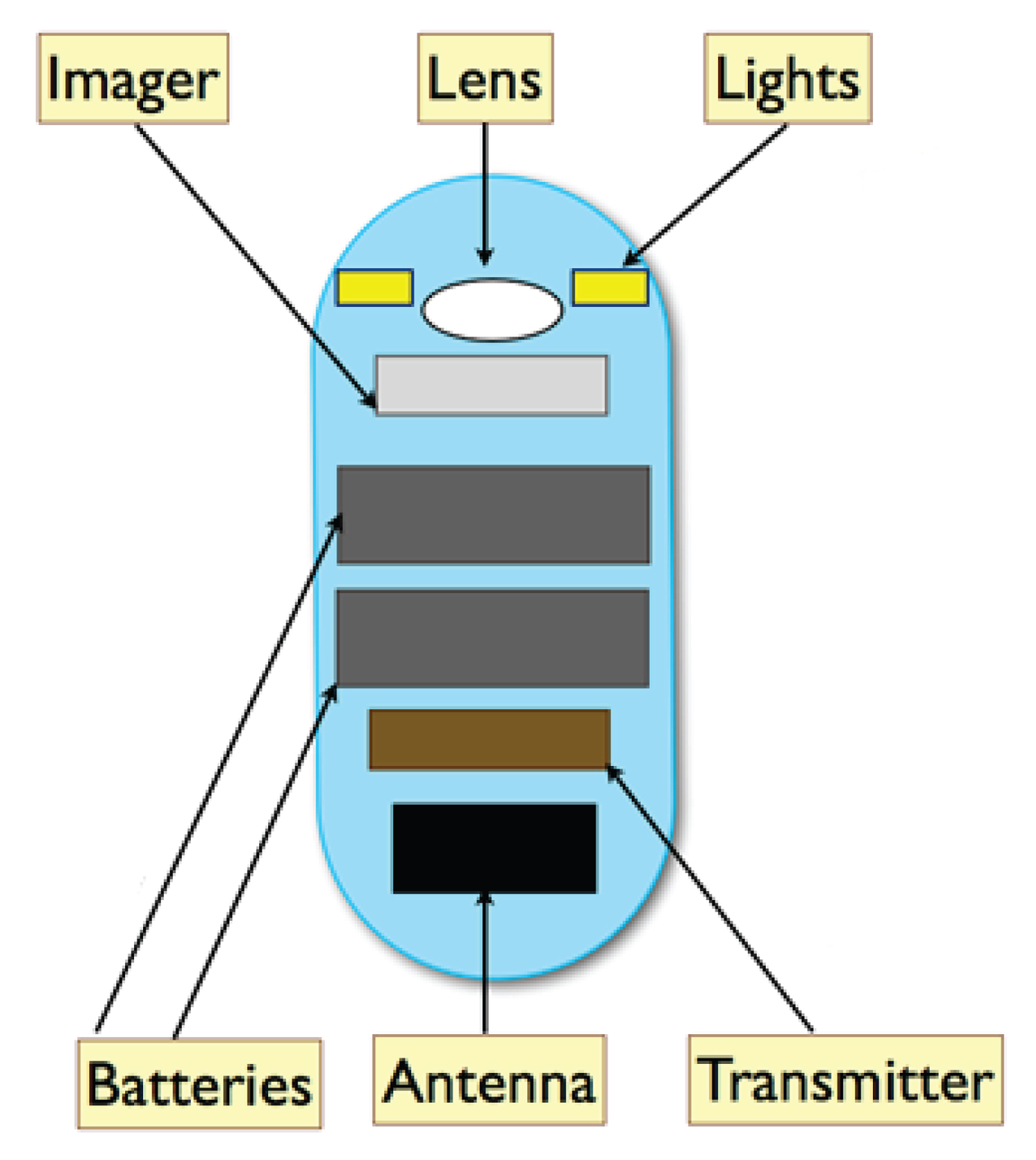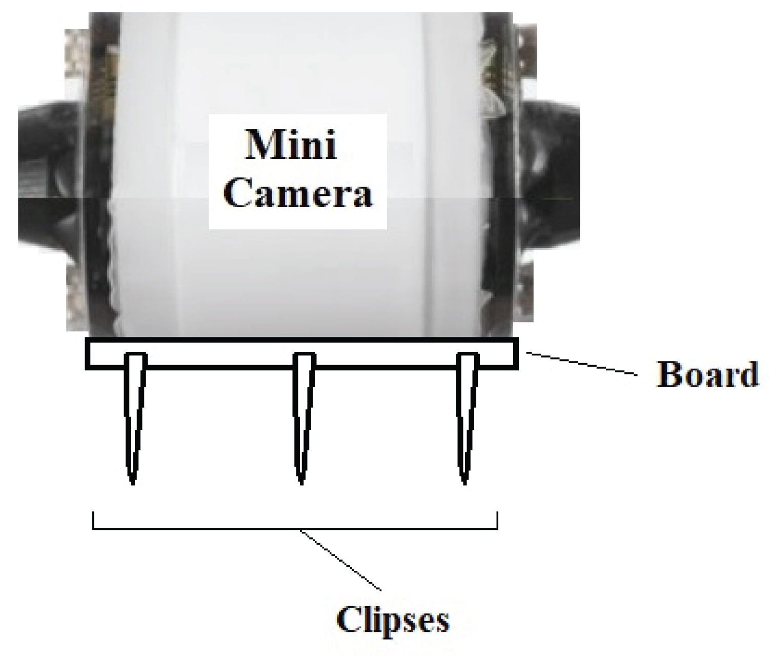 Today there are cameras with these features using by Gastroenterologists for visualizing the intestinal system during capsule endoscopy. Colon capsule endoscopy is a wireless and minimally invasive technique for visualization of the whole colon [5]. These cameras are not small enough for visualizing upper respiratory tract. In Figure 1 we could see one of these cameras (Figure 1). In a capsule endoscopy camera there are spaces between camera head and outer sites of device in each end. Every space's length is 5.6 mm. There are betteries inside the device is enough for 8 hours. Batteries length is up to 10 mm (Figure 2). The camera wich could use for visualizing the upper respiratory tract needs batteries just for 20 minutes. It doesn't need the spaces between camera head and outer layer of device. It could be at least 16-20 mm shorter than the camera wich uses during capsule endoscopy. The mini camera should have clipses at it's board of back side for attaching to soft tissues (Figure 3).