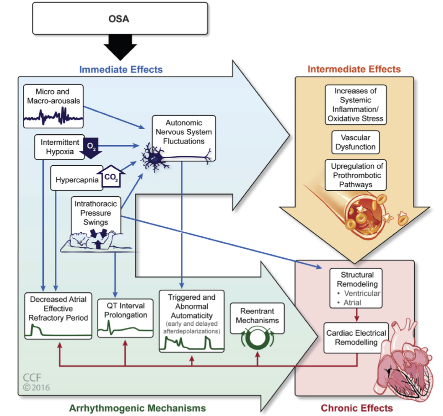 Figure 1: Pathophysiological pathways of obstructive sleep apnea that potentially predispose to cardiac arrhythmogenesis (Cleveland Clinic Center for Medical Art & Photography© 2016).