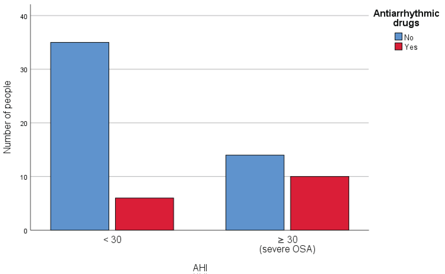 In the hypothesis of a possible influence of antiarrhythmic therapy, the frequency of the latter was analyzed compared to the presence or absence of severe OSA and a statistically significant difference emerged; as shown in Chart 3, in fact, it was found that the intake of antiarrhythmic drugs is more frequent in patients with severe obstructive apnea than in those with lower degrees of disease (p = 0.015).