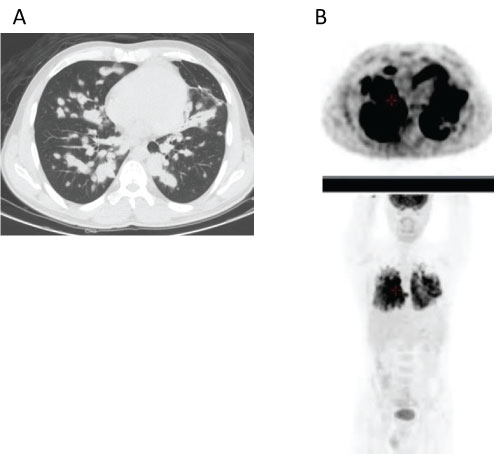 Figure 1: CT scan performed on 31/01/2015 demonstrated nodular infiltration of both lungs (Figure 1A) with a high uptake of FDG tracer on PET imaging (Figure 1B).