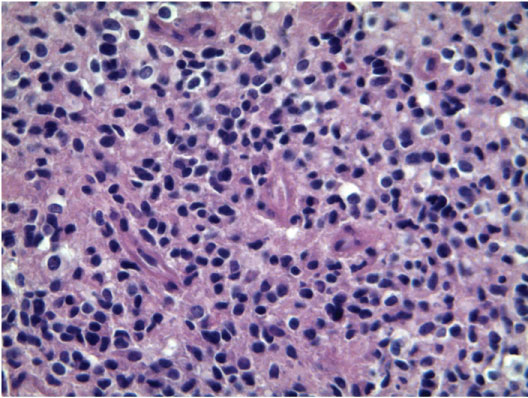 Figure 2: Histological specimen: The neoplasm is composed by a highly cellular proliferation of small cells with round and hyperchromatic nuclei and minimal discernible cytoplasm and with brisk mitotic activity (H-E 40x).