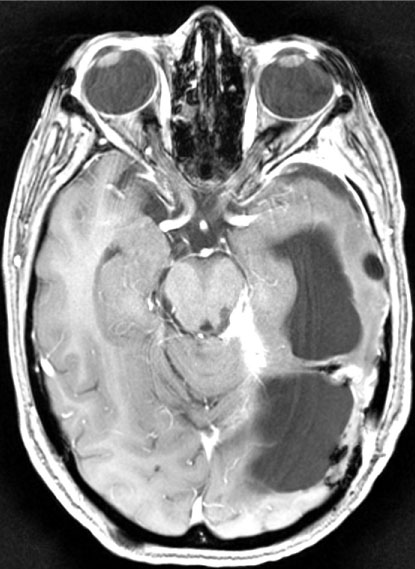 Figure 2: 8 months post-treatment, in a routine follow up of the patient in Figure 1. Notice gross total resection and improvement in the amount of brain shifting which was noticed prior to surgery.