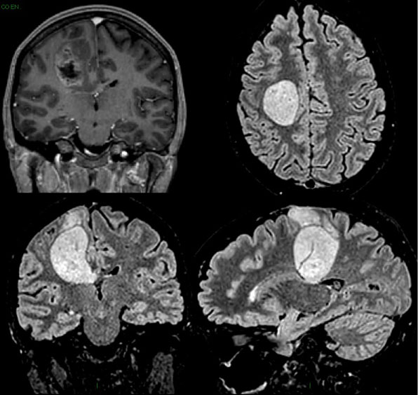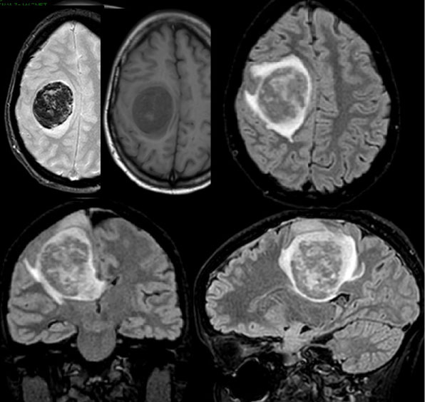 Figure 2: Second MRI, performed two days later, showing the hemorrhagic infarction of the previously diagnosed glioma.