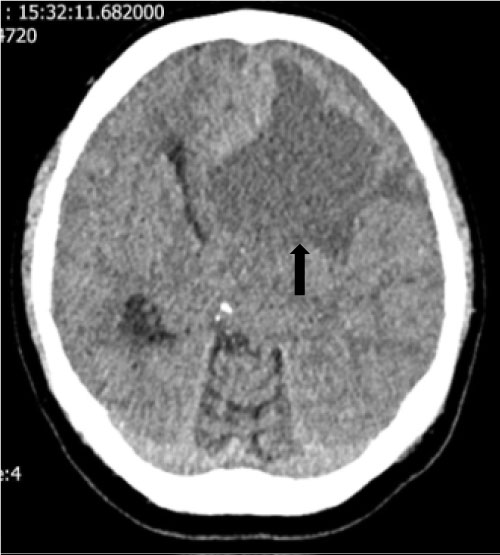 Figure 1: Shows hypodense lesion (black arrow) compressing the left frontal horn.