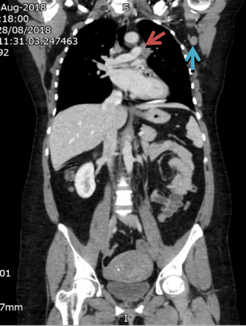Figure 3: Shows left hilar lymph node abutting left pulmonary artery (brown arrow) and in the left axilla (blue arrow).