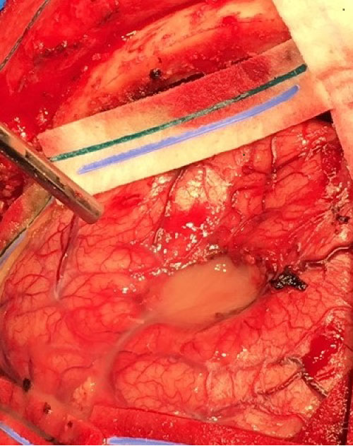 Figure 4: Intraoperative appearance of the left frontal lesion showing frank purulent fluid in the cavity.